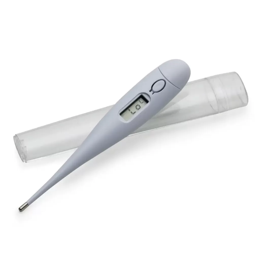Descrição: Termômetro branco digital, possui display e botão ao lado para ligar/desligar e parte traseira relevo quadrado para aplicar logo. Tampa na lateral pode ser removida para trocar bateria(acompanha uma LR41) e embalagem acrílica.