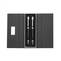 Descrição: Conjunto caneta e lapiseira em estojo de cartonagem com placa central para personalização. Clip metal com dois anéis em relevo, anel centralizado e dois anéis em relevo na ponteira e acionam por giro. Estojo revestida com espuma na parte interna.