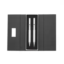 Descrição: Kit caneta e lapiseira de metal em estojo papelão com placa de metal(parte interna do estojo revestida com espuma). Caneta e lapiseira prata com detalhes coloridos e quadriculados, clip metal com anel superior na ponta e dois anéis centrais e acionam por giro.